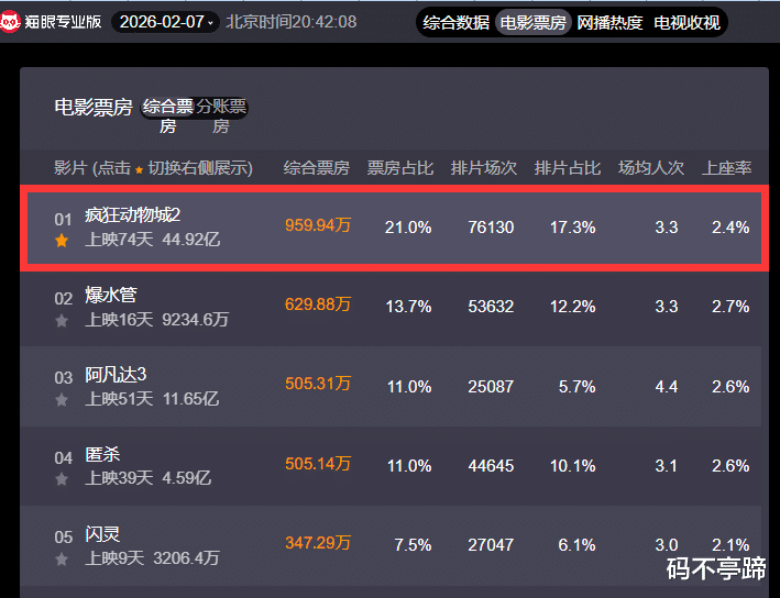 在中国市场,连卡梅隆心血巨作《阿凡达3》上映1个月就已经后劲不足了,只给了5%左右的排名;而《疯狂动物城2》上映都74天了,中国电影院居然还给它17.3%的超高排片,这是什么鬼操作?