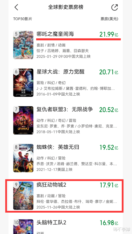 不过,毕竟还有4亿美元的差距,而不是4亿人民币,所以要想实现对《哪吒2》票房的超越,还是有很大难度的,因为北美市场基本上没什么上升动力了,欧洲市场就更别提了,那怎么办呢?于是中国市场就成了《疯狂动物城2》的最大票房动力。