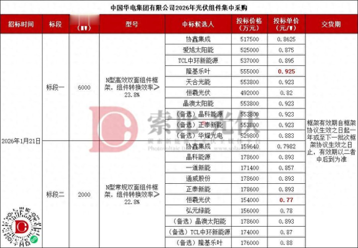 3月3日,中国华电集团有限公司2026年光伏组件集中采购中标公示,本次集采包括N型高效组件框架、N型常规组件框架两个标段,采购范围为框架有效期内华电集团部分新能源项目所需的N型高效及常规单晶硅双面双玻组件。